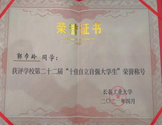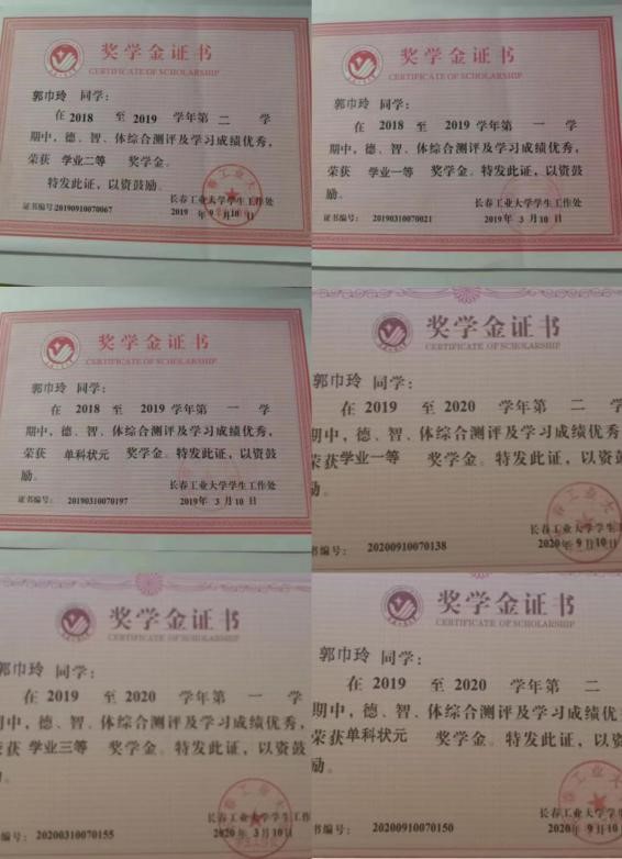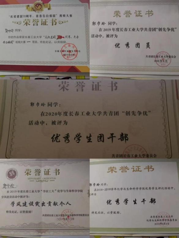 在校期间,曾获得2次国家励志奖学金,9次学业奖学金,3次单科状元;获得2020年度“长春市优秀共青团员”称号、云顶7610线路检测第二十二届“十佳自立自强老员工”、获得校第十六期青马班培训“优秀学员”、校“文明老员工”荣誉称号、校“优秀团干部”、校“优秀团员”,院“优秀员工干部”“学风建设突出贡献个人”等。在公司内开展学习经验分享会,分享学习心得,考研心得,帮助学弟学妹们复习方向及方法,激发同学们学习的热情。