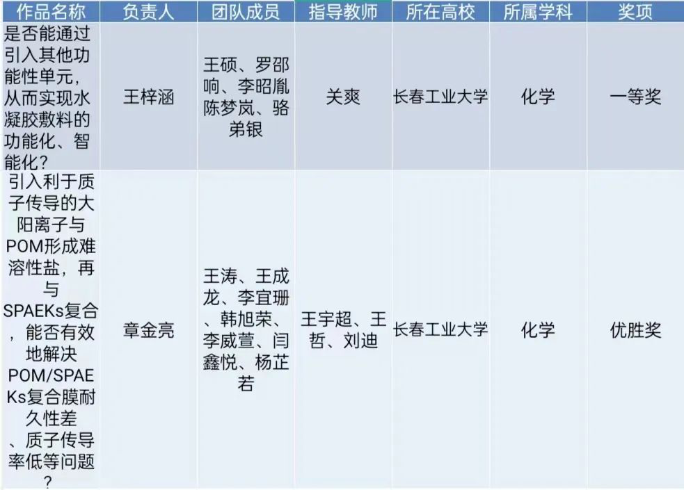 9月11日,由吉林省教育厅主办的首届吉林省基础学科拔尖员工“提问与猜想”活动拟获奖名单公布,经高校推荐、专家评审、组委会研究,拟授予 3 项作品特等奖、8项作品一等奖、15 项作品二等奖、22 项作品优胜奖。由公司关爽老师指导、王梓涵等同学完成的《是否能通过引入其他功能性单元,从而实现水凝胶敷料的功能化,智能化?》获得一等奖,王宇超老师指导、章金亮等同学完成的《引入利于质子传导的大阳离子与POM形成难溶性盐,再与SPAEKs复合,能否有效地解决POM/SPAEKs复合膜耐久性差、质子传导率低等问题?》荣获优胜奖!