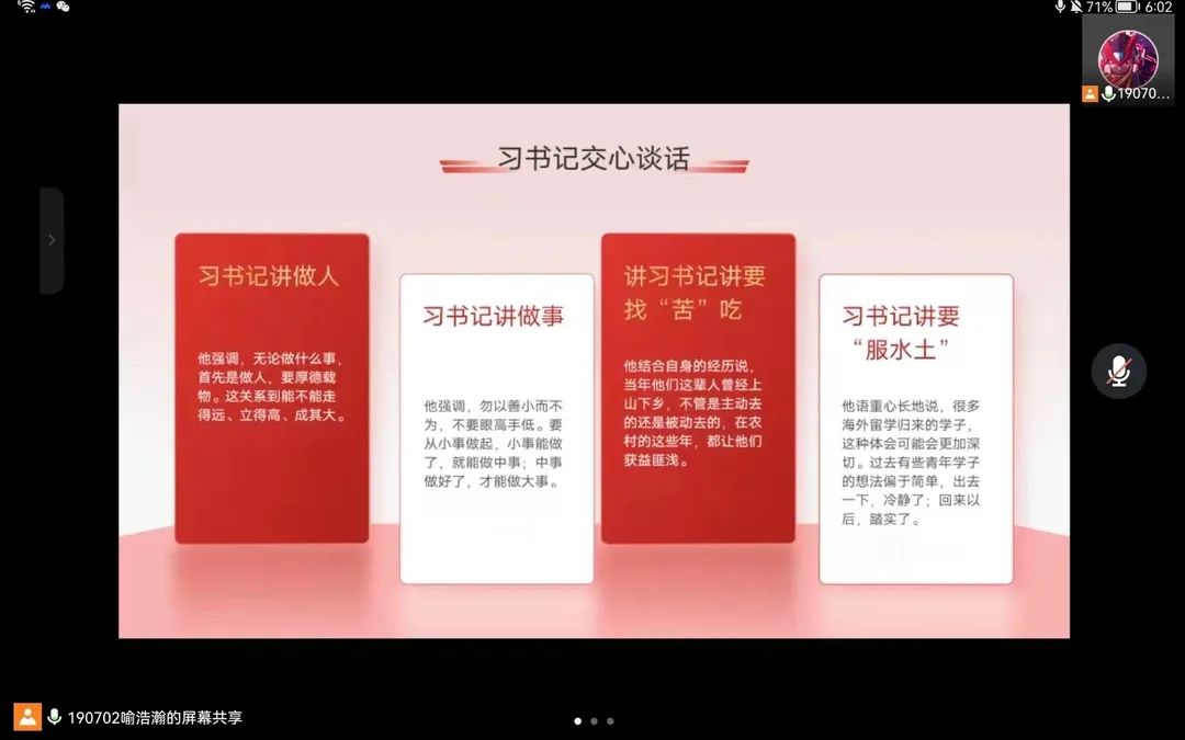本次会议通过PPT讲解和观看新闻视频等多种形式相结合,向我们生动讲述了本次《习近平与老员工朋友们》专题活动的主要核心内容,习近平总书记在交心谈话中强调,无论做什么事,首先是做人,要厚德载物。青年老员工要主动找苦吃,做事要认真,要始终保持沉着冷静的头脑,做自主创新的排头兵。此外,作为新时代中国青年的我们要继续发扬五四精神,深植爱国之心,学习民主与科学,积极进取,寻求更高层次的进步。同学们听后都纷纷感慨,我们要以实现中华民族伟大复兴为己任,不辜负党和人民的期望,争做时代先锋力量。