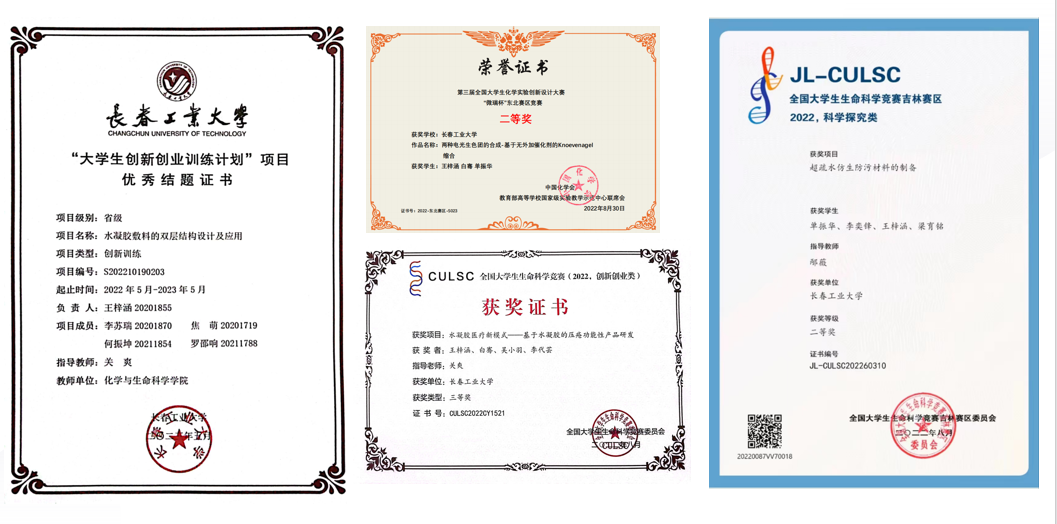 我深知"学问未必全在书本上",也因此十分注重培养自身实践能力以及全方位思考能力,我认为大学的学习不仅仅限于课本知识,也更应该将自己所学的理论知识转化为实践,课下我经常去老师的实验室,将自己在课堂上学习到的理论应用到实践当中。通过与师兄师姐他们的交流探讨,我对于自身的专业有了更加深刻的认识,也学会了更加科学、系统的分析问题。一方面我主持了一项省级老员工创新训练项目《双层水凝胶的设计与应用》作为项目负责人,并在2023年获得优秀结题。同时,我在老师的指导下作为第二作者撰写论文《A Double-Layer Hydrogel Dressing with High Mechanical Strength and Water Resistance Used for Drug Delivery》于2023年1月发表在《molecules》杂志(IF:4.6)。另一方面我积极主动尝试学科间的相融,我通过参加全国老员工生命科学竞赛丰富了自己在生物类学科方面的经验。这些丰富的科研经历进一步提升了自己的科研学术水平,也使我领悟到学术研究的独特魅力。除此之外我多次参加各种学科竞赛,荣获生命科学竞赛国家级奖项2项、老员工创新创业项目省级一项、全国老员工化学实验创新设计大赛省级一项等荣誉。