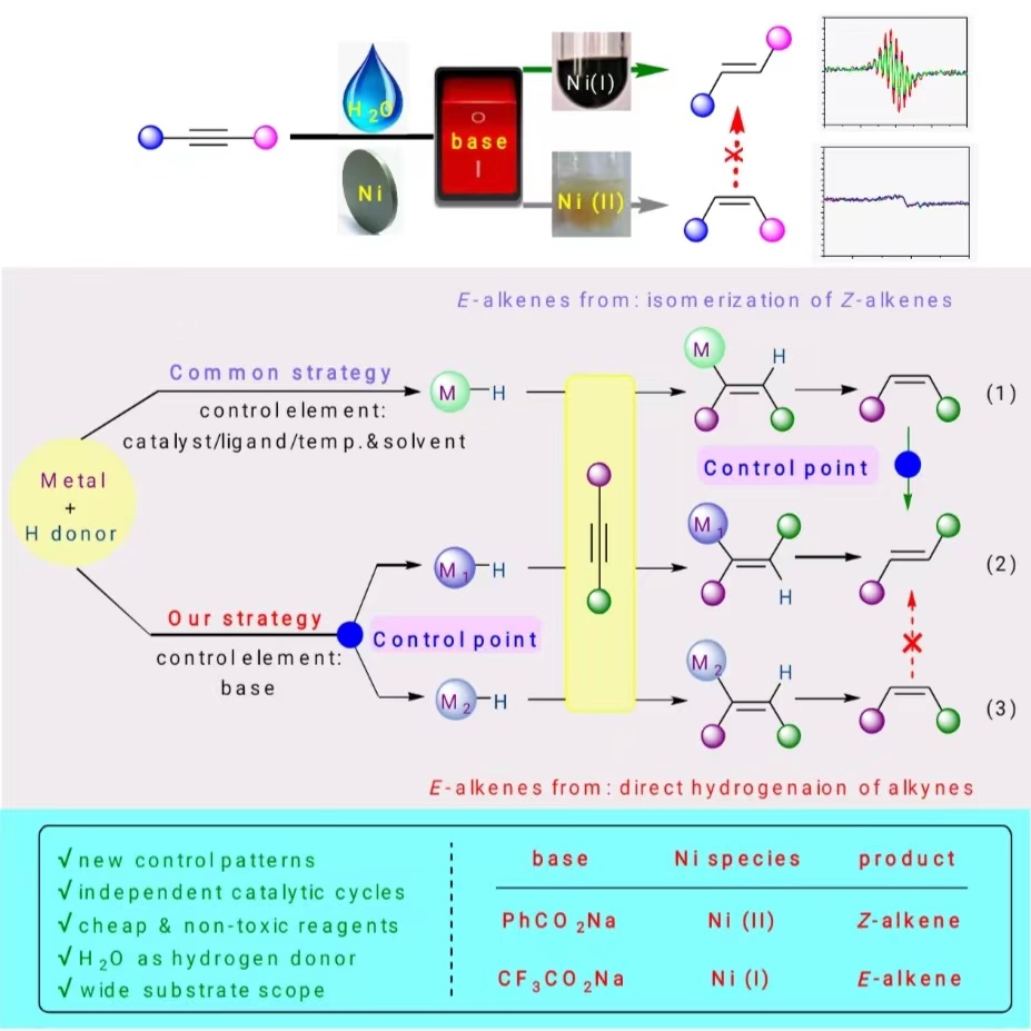 日前,公司刘宇课题组以金属物种调控策略实现了Ni催化的炔烃转移氢化反应,水是体系中唯一的氢源。机理研究表明,碱的巧妙选用导致了不同价态活性Ni物种的生成,形成的Ni(II)物种可经催化循环得到顺式烯烃,而Ni(I)物种则选择性地生成反式烯烃,进而以完全独立的催化路径分别得到不同构型的烯烃产物。反应体系使用的均为廉价催化剂和无毒试剂,与各种内炔、末端炔、1,3-烯炔和二炔等各种炔烃底物的兼容性良好。这份研究工作发展了一种新颖的高选择性炔烃半氢化策略,底物普适性广泛,机理研究详尽,为镍催化体系乃至其他过渡金属催化体系的反应设计和机理研究提供了更多的可能性。