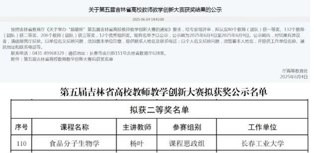 近日,吉林省第五届高校教师教学创新大赛决赛落下帷幕,我院杨叶老师凭借《食品分子生物学》课程的创新教学实践,在课程思政组中脱颖而出,斩获省级二等奖! 这是公司在该赛事中首次晋级决赛取得的最佳成绩,实现了历史性突破!