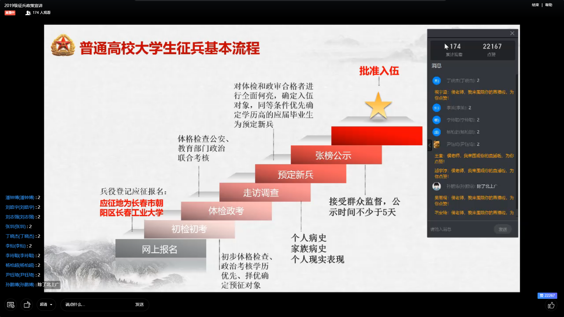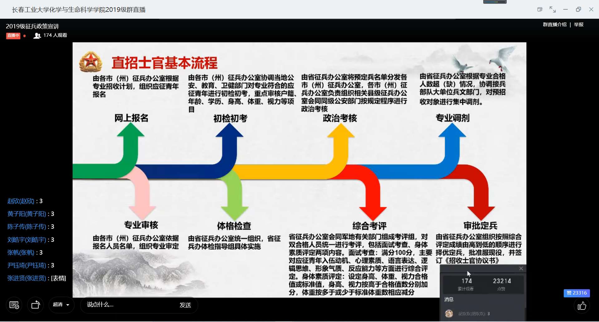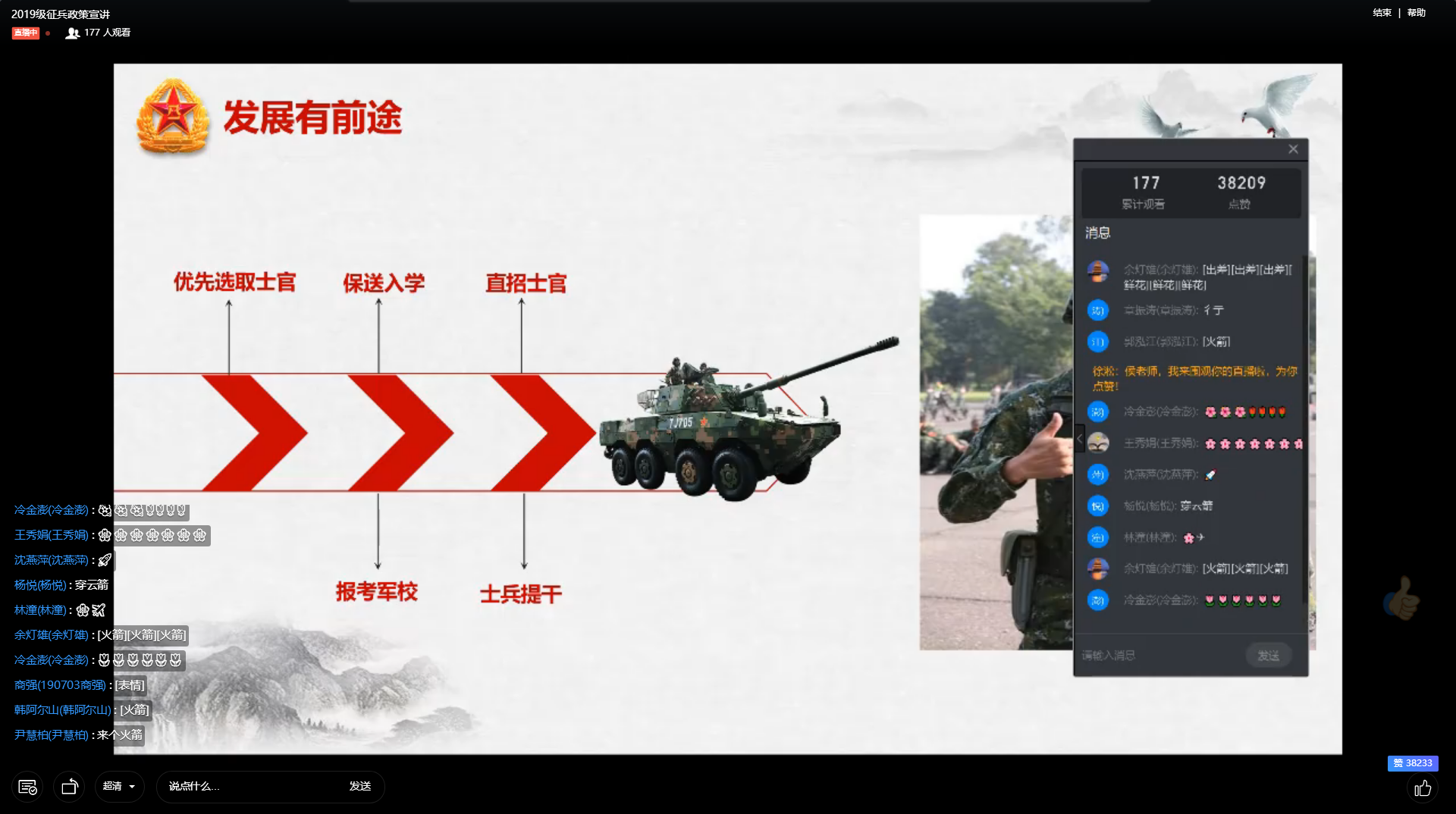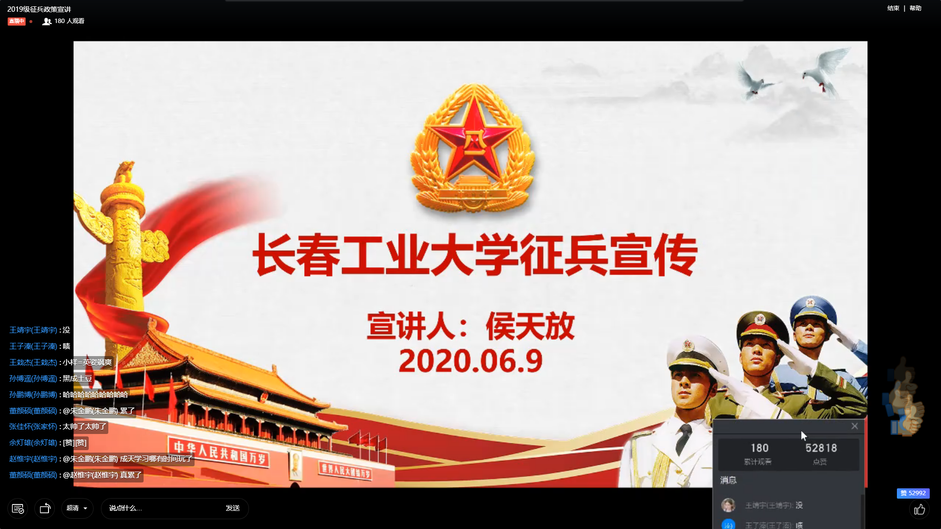 会上,侯天放老师以“携笔从戎、无悔青春”为主题,从政治有优待、经济有收益、发展有前途、就业有助力、学业有保障、创业有扶持六个方面对2020年吉林省征兵政策进行了详细解读。宣讲结束后,侯天放老师在线解答了同学们提出的入伍体检、政审、定兵等相关问题。