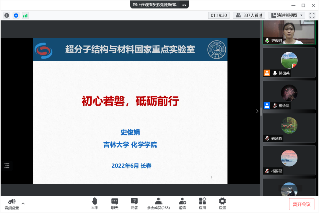 会上,姜延晓,王显,史俊娟,陈金星四位优秀毕业生分别以“向优秀之人看齐做更好自己”、“质子交换膜燃料电池:从催化剂到器件性能表达”、“初心如磐,砥砺前行”、“在长春的十年——从工大到应化所”为主题向同学们详细介绍了个人的学术研究方向,研究领域,个人就业经验以及课题组具体情况,讲述了自身考研复试的经历和经验,追忆在工大四年的宝贵时光,表达了对母校和老师的感谢和对老师同学的美好祝愿,并对同学们提出的有关考研和出国留学流程等问题进行了详细解答。最后,孙国英副经理进行总结,她鼓励同学们向优秀员工看齐,注重培养自身的科研兴趣和辩证思维能力,努力实现自我的人生价值。