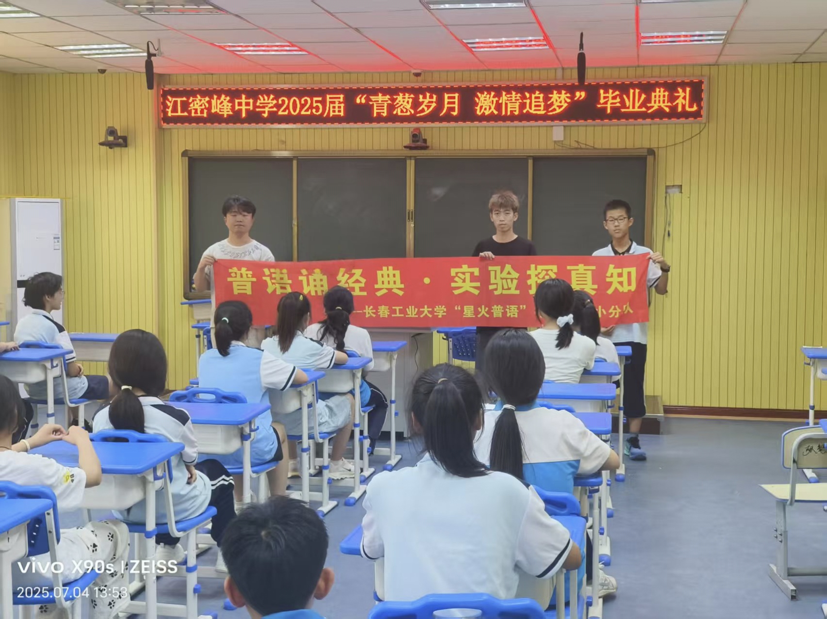 活动当日,江密峰中学的教室里气氛热烈。“星火普语”小队成员们精心准备,首先通过播放生动有趣的普通话推广短视频,吸引了同学们的注意力,激发了大家对说好普通话的兴趣。随后,小队成员带领同学们进行经典诗词诵读,一句句抑扬顿挫、字正腔圆的诵读声在教室中回荡。同学们在诵读中感受着中华诗词的魅力,也在潜移默化中纠正了发音,提升了普通话表达能力。