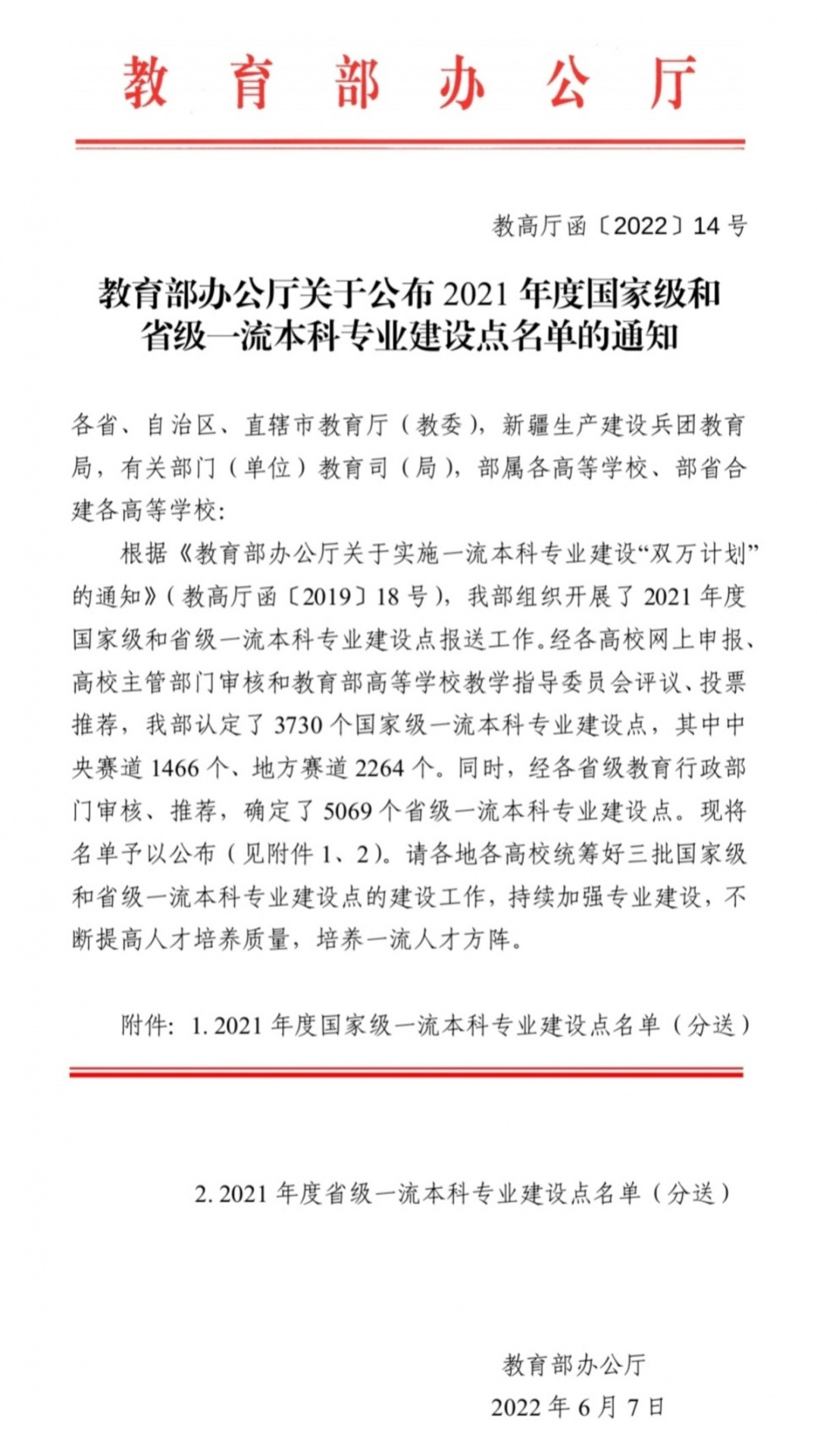 近日,教育部办公厅公布了2021年度国家级和省级一流本科专业建设点名单。公司食品科学与工程专业获批吉林省一流本科专业建设点!