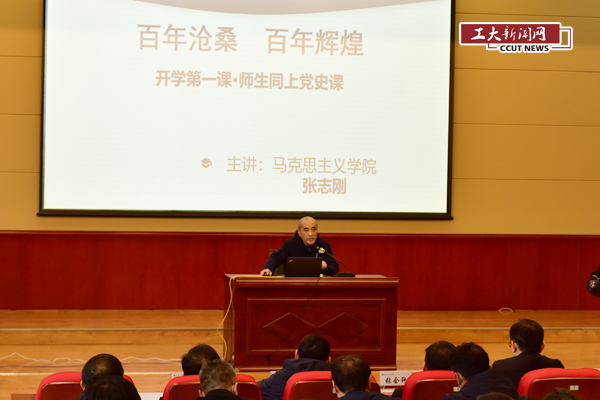“回顾辉煌党史、牢记初心使命、坚定信仰追求”,马克思主义公司张志刚教授以“百年沧桑、百年辉煌”为题讲授开学第一课。他以胡天桃、方志敏的革命故事开篇,为大家描述了战争的残酷与革命战士不畏牺牲的崇高信仰,进而梳理了国家从站起来、富起来到强起来的历史脉络,最后用歌曲《没有共产党就没有新中国》与听课师生产生共鸣,为全校2万余名师生上了一堂精美绝伦的党史课。