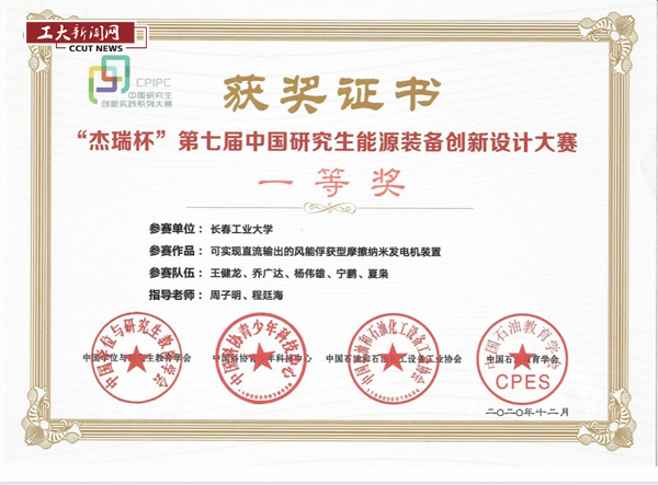 新闻网讯(通讯员 王健龙)近日,由中国学位与研究生教育学会和中国科协青少年科技中心主办的“杰瑞杯”第七届中国研究生能源装备创新设计大赛决赛在西安石油大学举行。机电工程公司研究生王健龙、乔广达、杨伟雄、宁鹏、夏枭团队参赛的《可实现直流输出的风能俘获型摩擦纳米发电机装置》在众多高校中脱颖而出,荣获国家一等奖。这是公司在本项赛事中取得突破后的最好成绩。