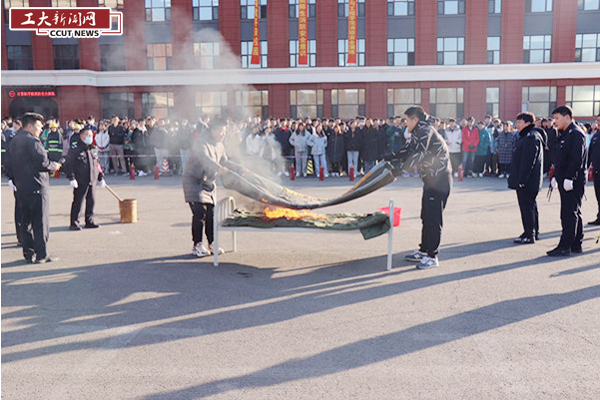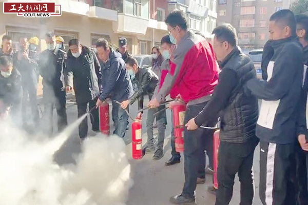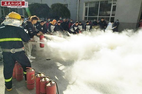 在灭火演示区域,安全处防火科科长金光石重点讲解了火灾类型、灭火器使用、初期火灾处置等基本消防知识,指导师生进行现场实操演练。