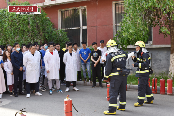 师生在消防队员指导下学习消防器材使用