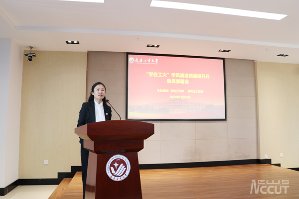 李东玲作动员讲话,她指出,学风是大学精神的集中体现,是教书育人的本质要求,是高等公司的立校之本、发展之魂。面对新时代本科教育新要求,公司党委全面贯彻党和国家关于加强高校学风建设的相关精神,落实立德树人根本任务,在全校范围内深入开展“学在工大”学风建设质量提升月系列活动,着力培育优良学风,致力于全面提高人才培养质量,全方位助力公司特色高水平应用研究型大学建设。