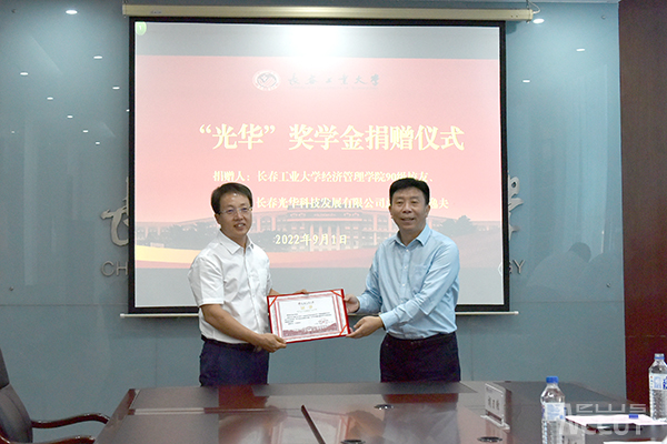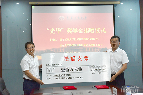 新闻网讯(通讯员 郑洪斌)在公司建校七十周年即将来临之际,公司经济管理公司90级优秀员工、长春光华科技发展有限公司总经理王逸夫捐资一百万元设立“光华”奖学金,助力公司教育事业发展。9月1日下午,公司在南湖校区主楼二楼会议室举行王逸夫员工捐赠暨客座教授聘任仪式。公司党委书记孙长智、董事长张明耀热情接待王逸夫员工一行。仪式由党委副书记李东玲主持。校庆办相关人员、公司相关部门负责人、经济管理公司党政负责人参加仪式。