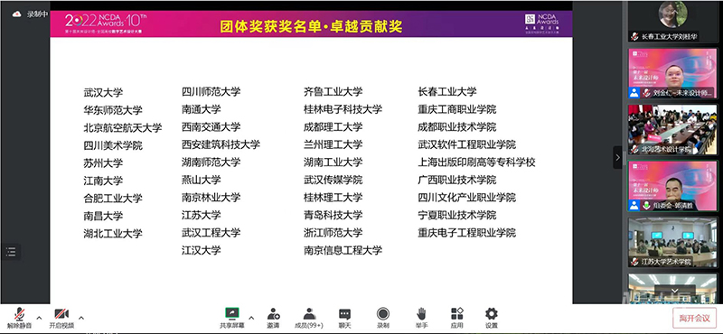 新闻网讯(通讯员 刘桂华)11月26日,第十届未来设计师·全国高校数字艺术设计大赛(NCDA大赛)总结会暨第十一届未来设计师•全国高校数字艺术设计大赛赛事发布会在线上成功举办。公司作为吉林赛区承办高校参会,再次获得国赛团体奖最高荣誉“卓越贡献奖”,并获国家级一、二、三等奖共16项,2人获全国优秀组织教师,4人获全国优秀指导教师。公司获评“全国高校设计赋能乡村振兴志愿服务先进单位”。