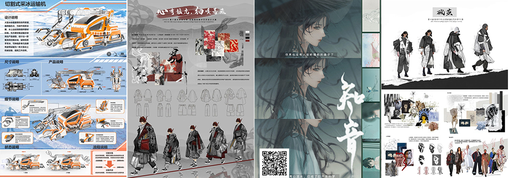 国赛一等奖获奖作品展示(从左往右依次为 工业产品设计类作品:《切割式采冰运输机》创作:刘宸汛 指导教师:何丽鹏;时尚设计类作品:《心有猛虎,细嗅蔷薇》创作:王彤彤,韩欣桐 指导教师:葛英颖;动画与视频设计类作品:《知音》 创作:李心心 指导教师:刘桂华;时尚设计类作品:《破茧》创作:周子涵 指导教师:兰天)